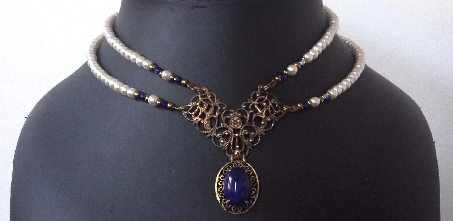 Elégant ras de cou d'inspiration victorienne. Pièces et monture en laiton sans nickel, sans plomb, sans cadium, cabochon de pierre de Lapis Lazuli et perles de verre. Bijou adaptable à toutes les tailles grâce à sa chaîne d'extension. Personnalisable à la demande